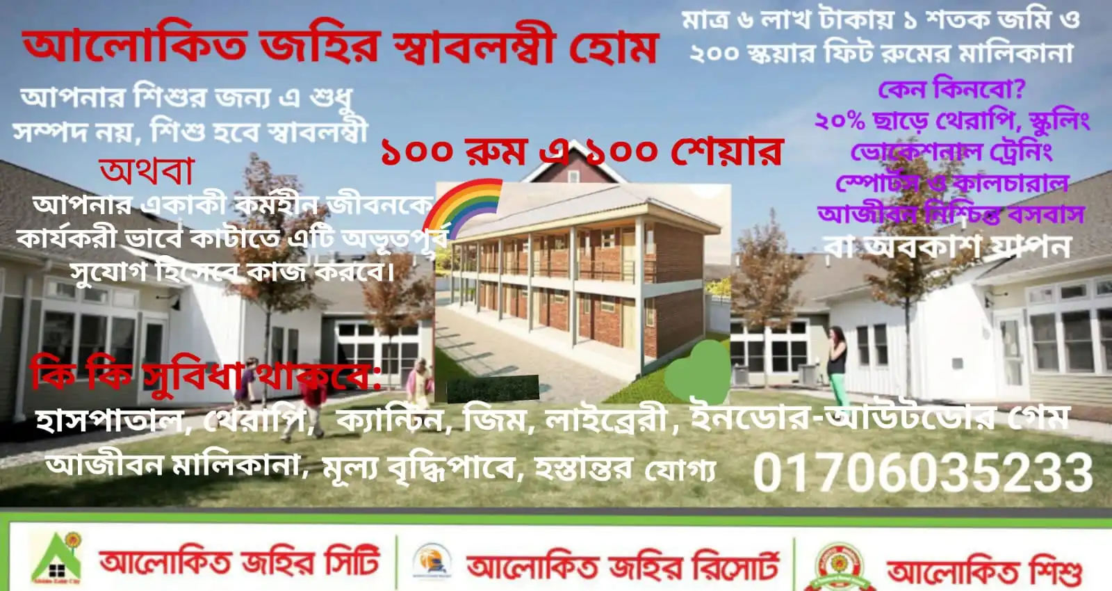 আলোকিত জহির স্বাবলম্বী হোম একটি ব্যতিক্রমধর্মী আবাসন ধারণা—যেখানে শুধু থাকার জায়গা নয়, একজন মানুষ কীভাবে আত্মনির্ভরশীল জীবন গড়ে তুলতে পারেন, তার পূর্ণ সুযোগ দেওয়া হয়। এটি বিশেষ করে অবসরপ্রাপ্ত, বিধবা, অসহায়, কিংবা কাজ করতে আগ্রহী নারীদের জন্য ডিজাইনকৃত একটি মানবিক উদ্যোগ, আলোকিত জহির স্বাবলম্বী হোম শুধু একটি ছাদ নয়, বরং একজন মানুষের সম্মানজনক ও স্বনির্ভর জীবনযাপনের একটি নিরাপদ আশ্রয়। এখান থেকে একজন মানুষ আবার ঘুরে দাঁড়াতে পারে—নতুন আশা, নতুন সম্ভাবনার দিকে, এই শিক্ষাজোন শুধু একজন শিক্ষার্থীর জন্য নয়—পুরো সমাজের জন্য একটি আলোর পথ। আধ্যাত্মিকতা, আধুনিকতা ও আত্মনির্ভরতার সমন্বয়ে গড়ে উঠবে আগামী দিনের আলোকিত প্রজন্ম।